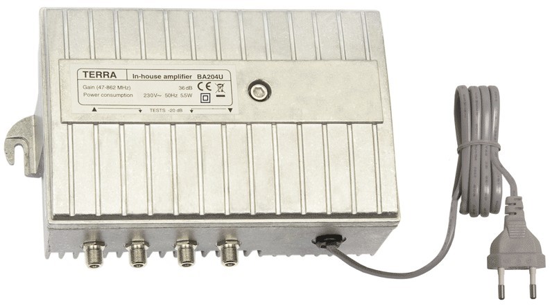 Nagyteljesítményű házi erősítő, cserélhető modulos lehetőség, vízmentes kivitel, 47/75/87-862MHz, 36dB szabályozható, 107dBuV, F csatlakozó, 5-30/55/65MHz, 19dB szabályozható visszirány, 230VAC.