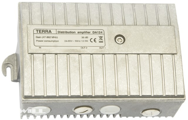Univerzális erősítő, vízmentes kivitel, 47/75/87-862MHz, 36dB szabályozható, 108dBuV, PG11 csatlakozó, 5-30/55/65MHz visszirány, 24-65VAC.