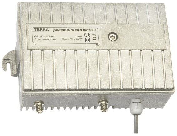 Univerzális házi erősítő, cserélhető modulos lehetőség, bemeneti csillapítás 0-18dB, vízmentes kivitel, 47/75/87-862MHz, 36dB szabályozható, 111dBuV, F csatlakozó, 5-30/55/65MHz visszirány, 230VAC.