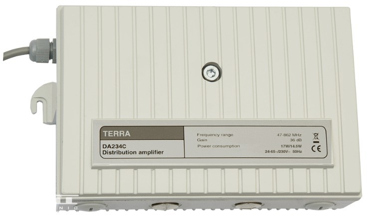 Univerzális házi erősítő, cserélhető modulos lehetőség, bemeneti csillapítás 0-18dB, vízmentes kivitel, 47/75/87-862MHz, 36dB szabályozható, 112dBuV, F csatlakozó, 5-30/55/65MHz visszirány, 24-65/230VAC.