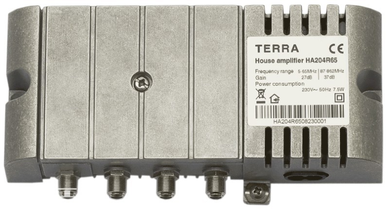 Házi erősítő, 47-862MHz, 37dB szabályozható, 105dBuV, F csatlakozó, 230VAC.
