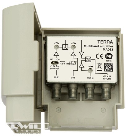 3 utas földi TV antenna közösítő, 174-260MHz 28dB/2x470-862MHz 2x34dB, 106dBuV, kapcsolható DC pass, 12V, 80mA.