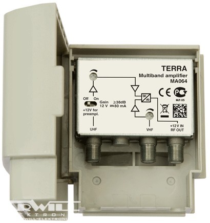2 utas földi TV antenna közösítő, 47-260MHz 30dB/470-862MHz 38dB, 106dBuV, kapcsolható DC pass, 12V, 80mA.