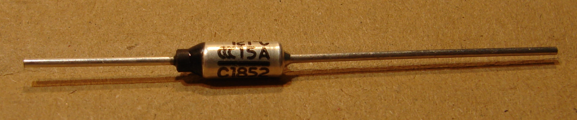 Hőbiztosíték, 250V AC, 15A, 142°C, d=4,2mm, hosszúság 14mm.
