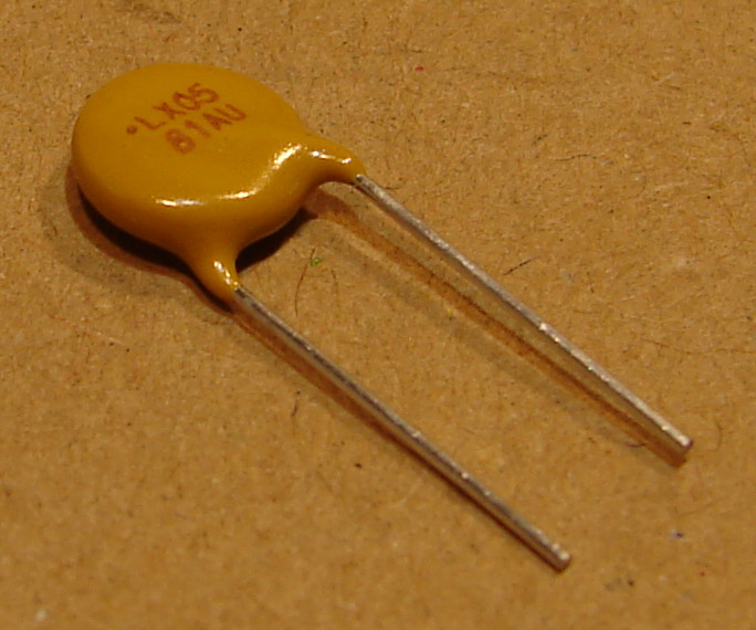 PTC alapú öngyógyuló biztosíték (multifuse), 240V AC, 50mA, 0,7W, d=7,2mm, vastagság 3,2mm, lábtávolság 5mm.