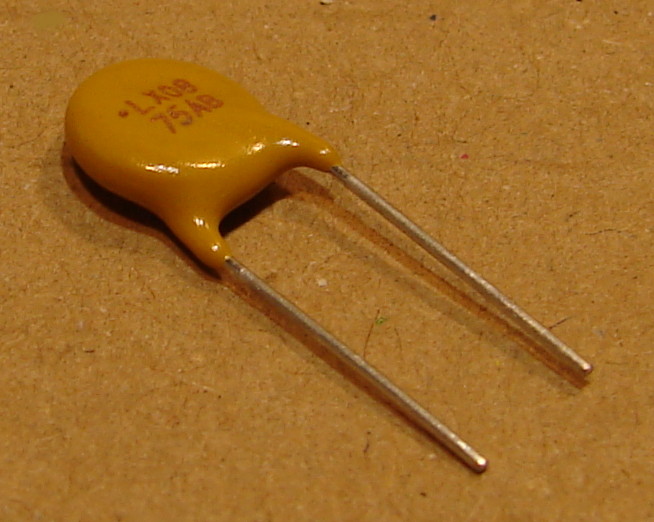 PTC alapú öngyógyuló biztosíték (multifuse), 240V AC, 80mA, 0,8W, d=8,3mm, vastagság 3,8mm, lábtávolság 5mm.