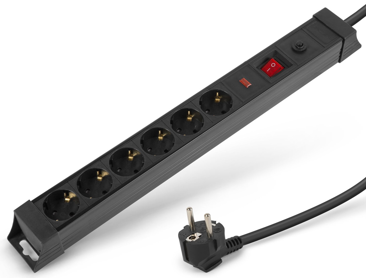 Hálózati konnektor elosztó, villám és túlfeszültség védelem, resetelhető, 230V AC, 16A, 1db földelt hálózati dugó, 6db földelt hálózati aljzat, kapcsolható kivitel, 3m vezeték.