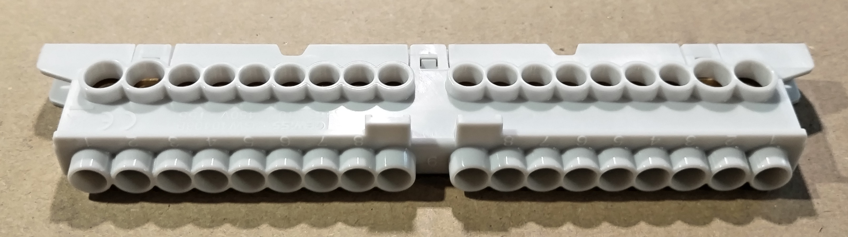 Hálózati sorkapocs sín, 450V AC, 80A, N+GND, 2x9 tag, 2x(2x16mm2 + 7x10mm2), csavaros kivitel.