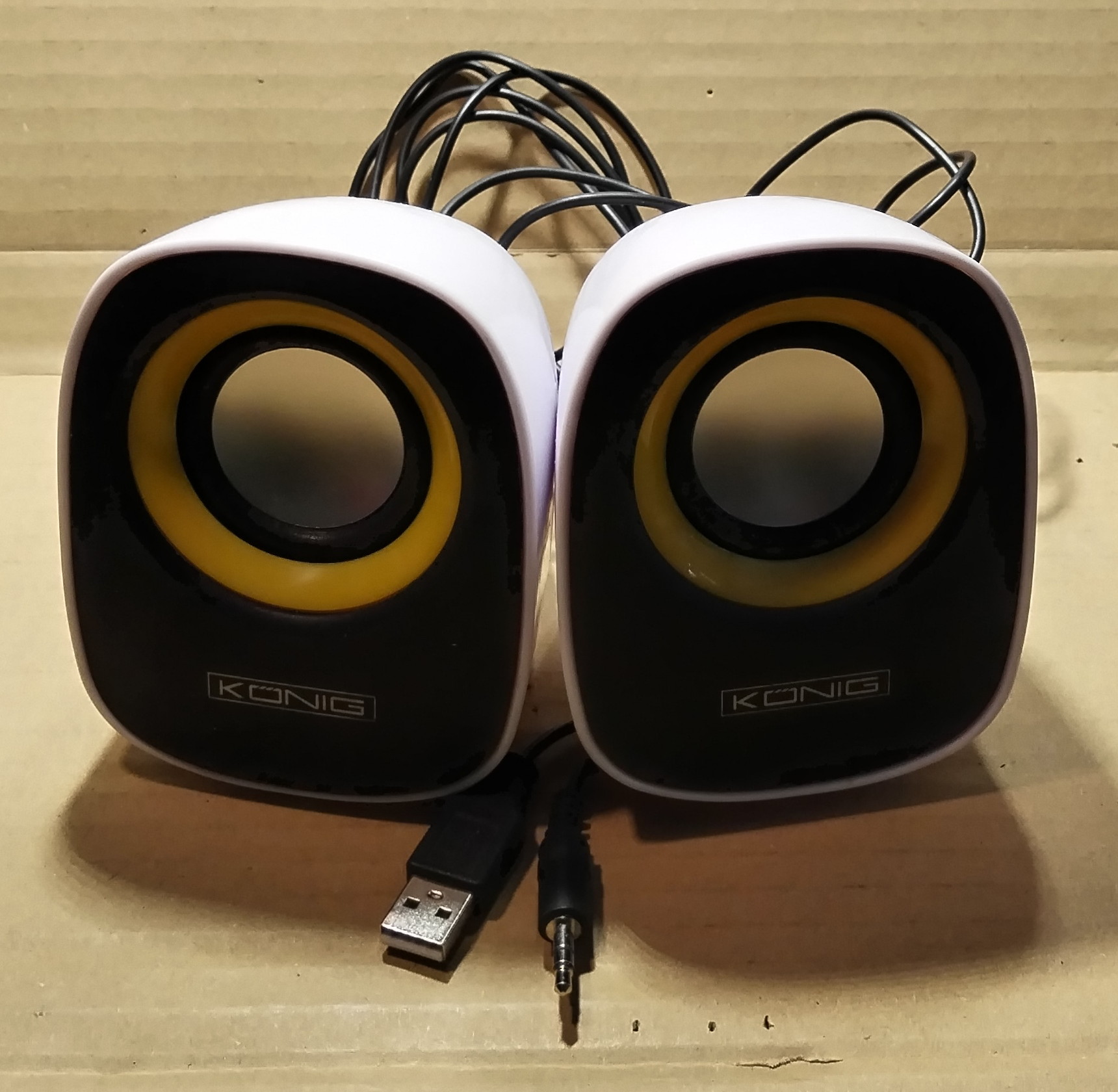 USB aktív hangfal, 8R, 2x2W, 5V DC, 60Hz-20kHz, 3,5mm sztereo jack dugó, USB A dugó.