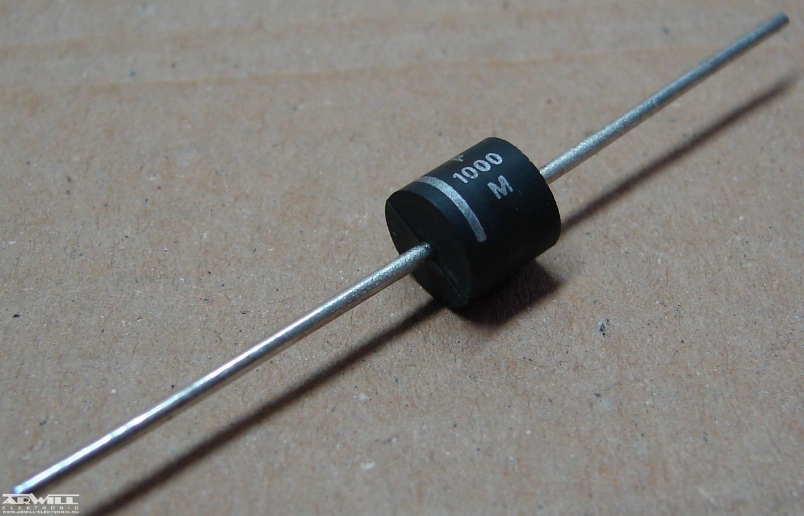 P1000M dióda, 1000V, 10A, furatba forrasztható kivitel, P-600 tokozás.