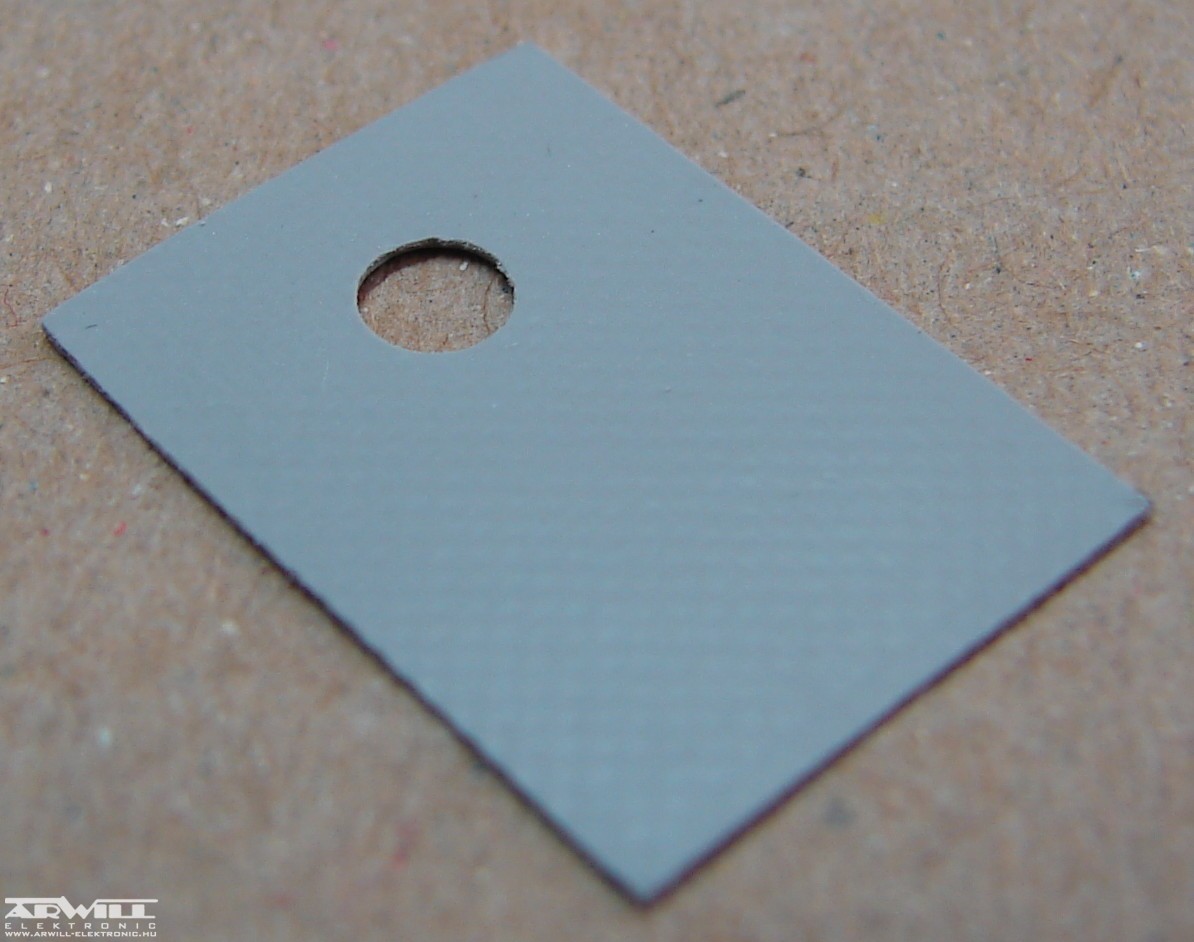 Hővezető szigetelő szilikon alátét TO-220 tokozású alkatrészekhez, átvezető gyűrűt igényel.