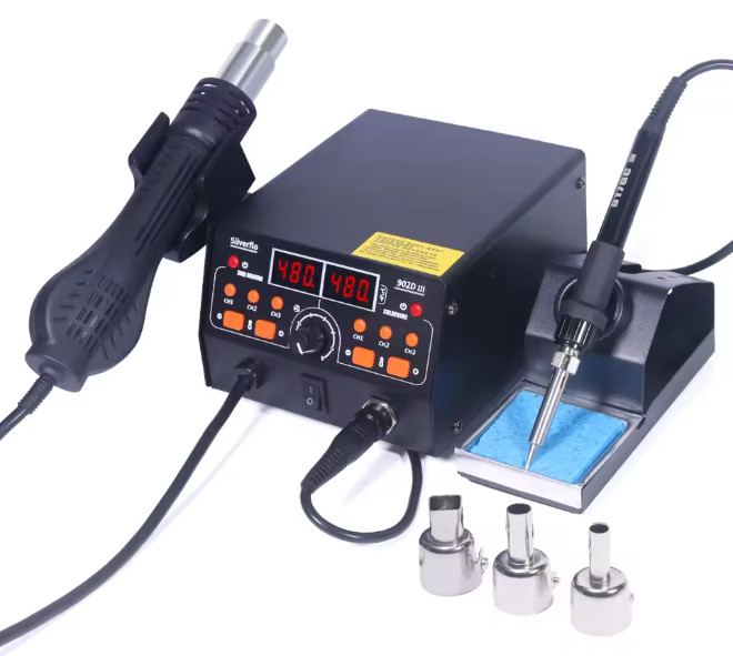 Forrasztóállomás, 240V, forrasztó páka 24V, 50W, 200-480°C állítható, 2R, állandó fűtés, cserélhető hegy, hőlégfúvó 240V, 700W, 100-480°C, 120l/perc, állítható légszállítás, °F/°C váltó, digitális kijelző, 3-3db előre beállítható hőfok, automatikus elalvás kikapcsolás, pákatartó, szivacs, 3db kiforrasztó feltét.(Tartalék hegy is kapható.)