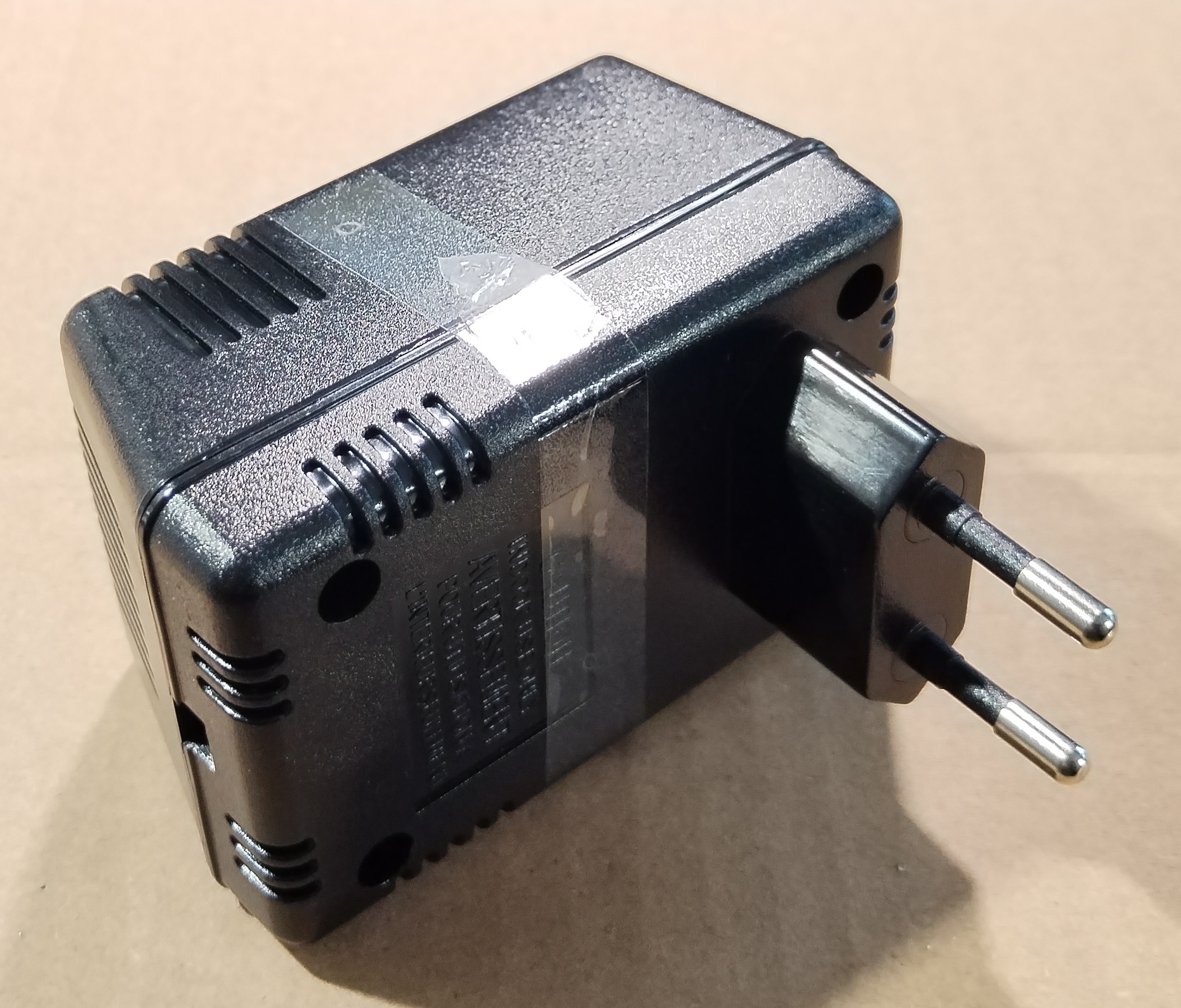 Műanyag tápegység doboz, szélesség 78mm, mélység 50mm, magasság 42mm, csavaros szerelés, kábel bevezetés, törésgátló, 2 pólusú AC dugó.