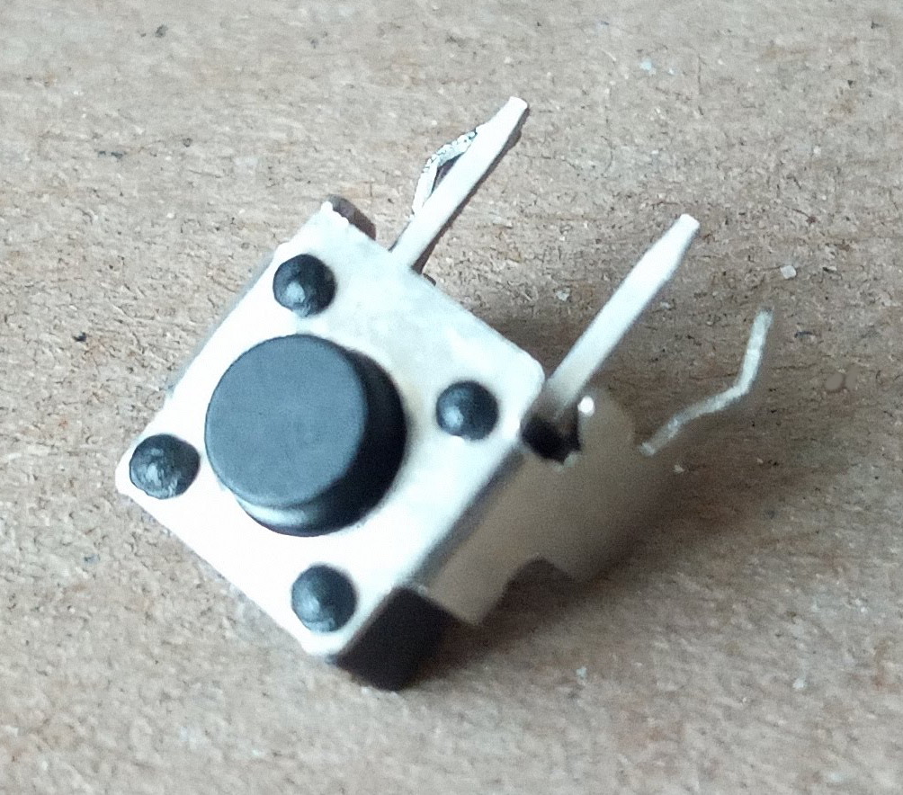 Miniatűr nyomógomb, 1 záró áramkör, 2 állás, 90° kivitel, működtető hossza 1,5mm, nyákba forrasztható kivitel, lábtávolság 5mm.