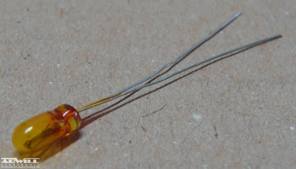 Rizsszem izzó, gépkocsi műszerfalakba, készülék előlapokba, 3V DC, 50mA, d=3mm, hosszúság 7mm, sárga hőálló lakk színezés, forrasztható kivitel.