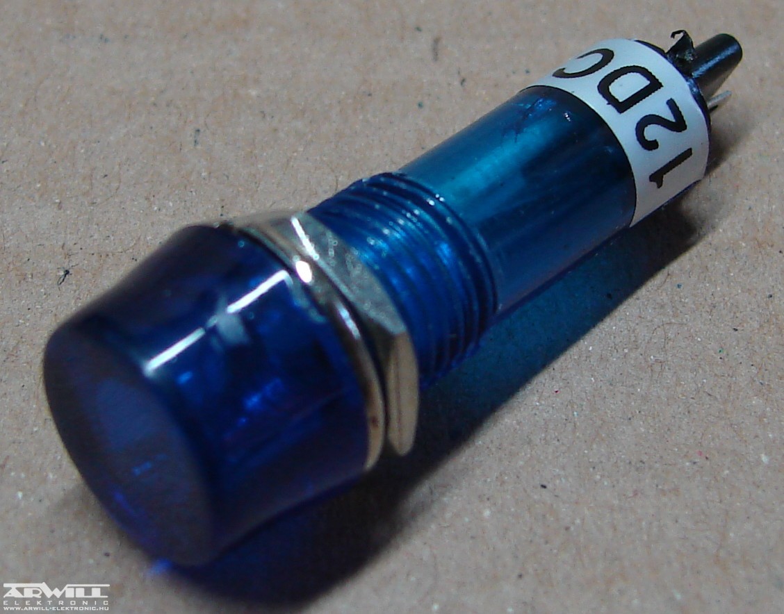 Visszajelző lámpa, 12V DC, kék, d=11,5mm, beépítési furat 10mm, beépítési mélység 38mm, forrasztható kivitel.