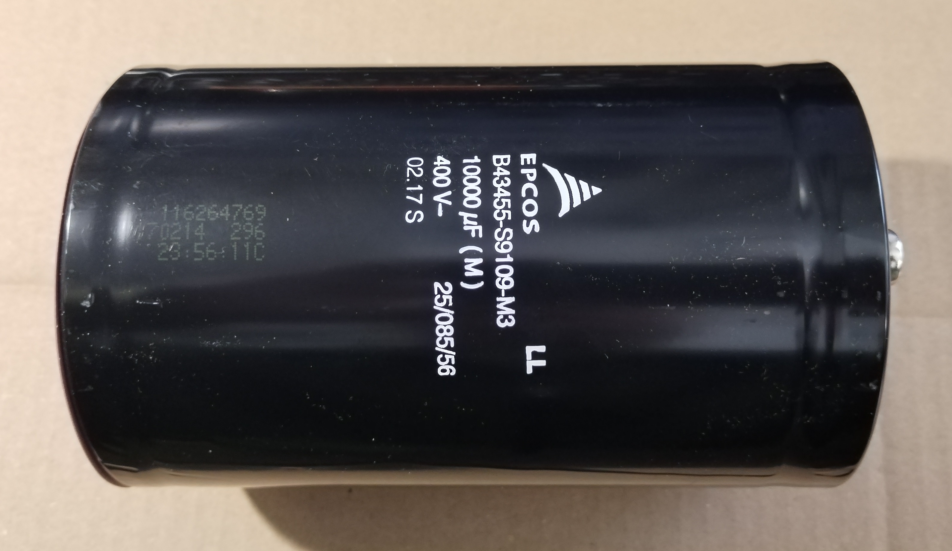 Elektrolit kondenzátor, 10000uF, 400V, 85°C, B43455-S91109-M3, LONG LIFE hosszú élettartamú, átmérő 90mm, magasság 145mm, M6 csavaros csatlakozás.