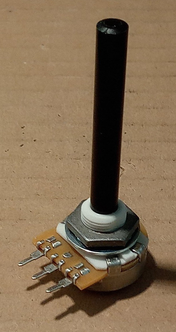 Fémházas, tengelyes, szénréteg potméter, 100k, 0,4W, mono, lineáris, tolerancia 20%, mechanikus forgási szög 300°, tengelyátmérő 6mm, fém test mérete d=20x9mm, tengelyhossz 43mm, menet hosszúsága 8mm, furatátmérő 10mm, lábtávolság 5mm, max. 500V DC.