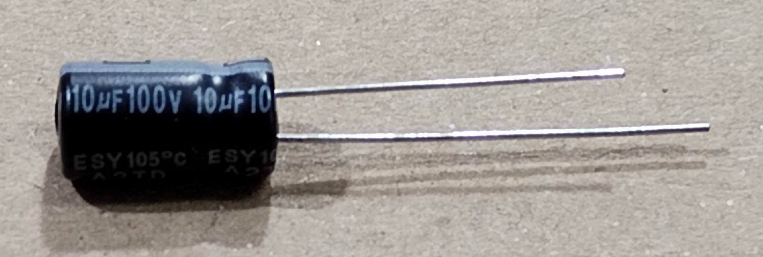 Elektrolit kondenzátor, 10uF, 100V, 105°C, ESY, átmérő 6,5mm, magasság 12mm, lábtávolság 2,5mm.