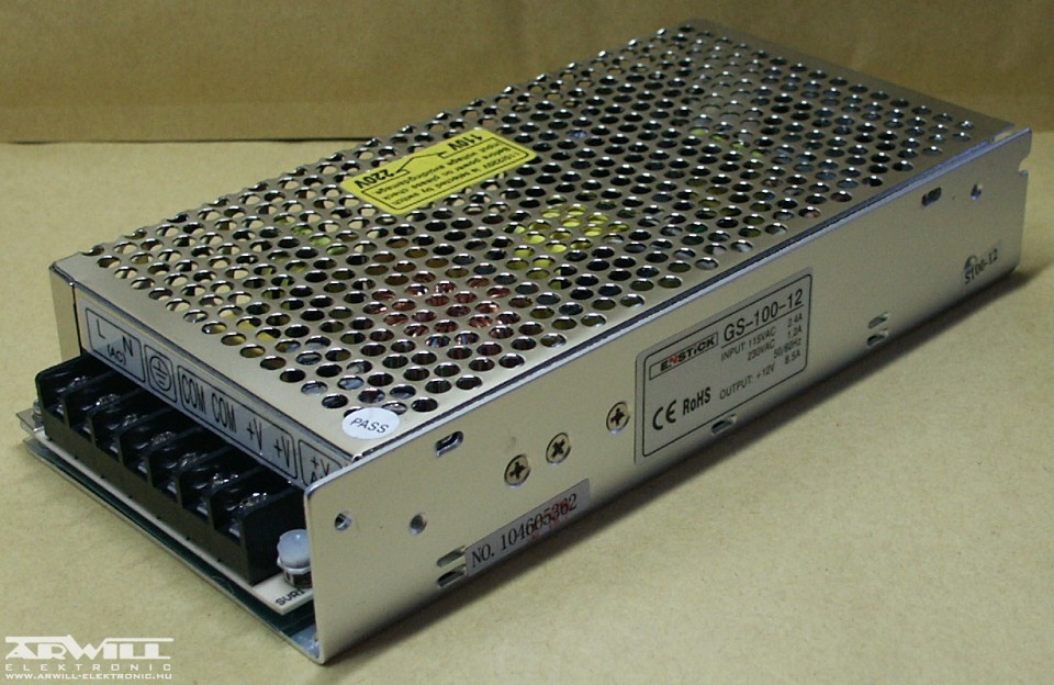 Hálózati kapcsoló üzemű, stabilizált, ipari, modul tápegység, 110-230V AC/12V DC, 8,5A, 100VA, sorkapocs kivezetéssel.