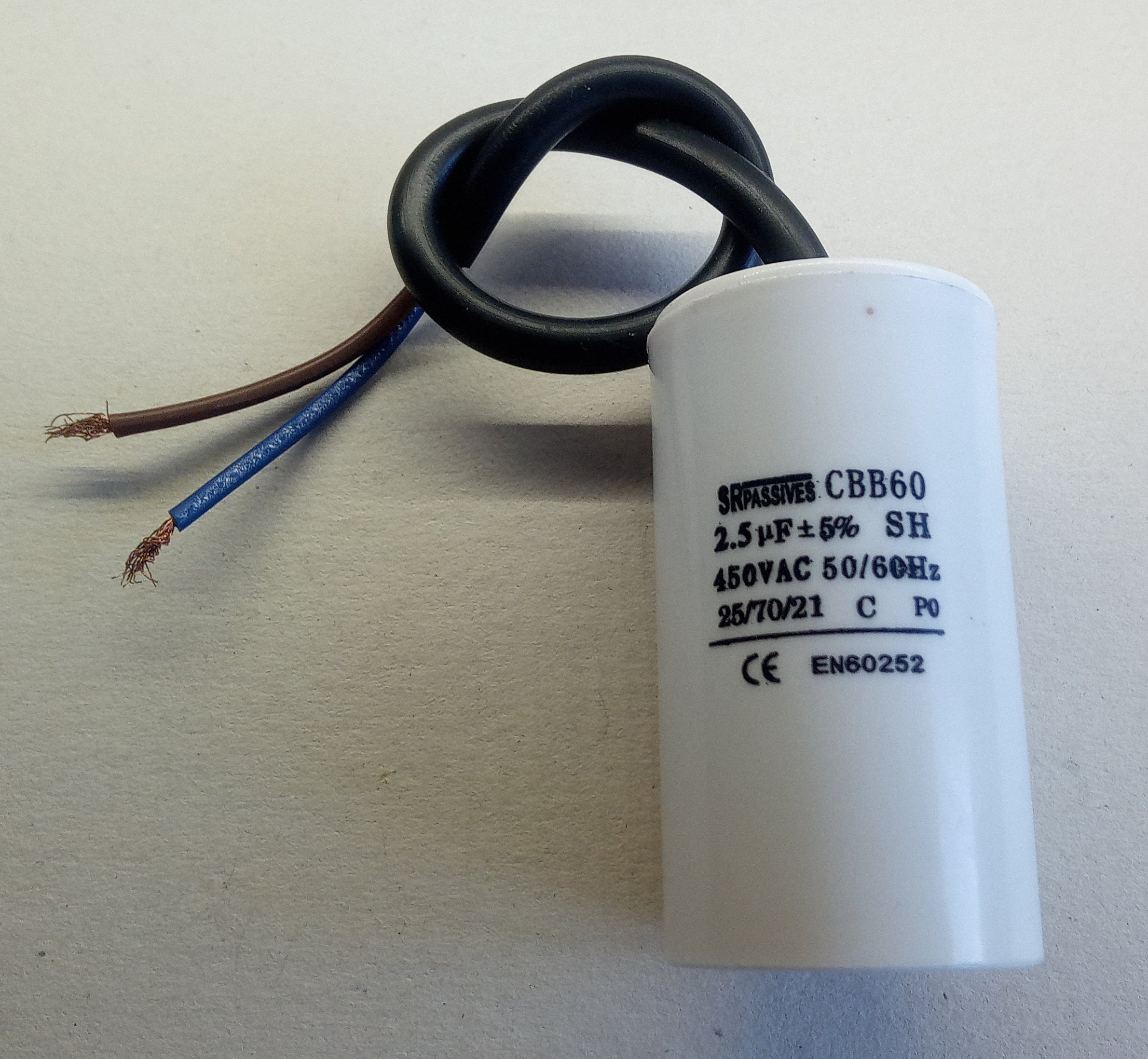 Fázistoló fólia kondenzátor váltóáramú motorokhoz, 2,5uF, 450VAC, 10%, vezetékes.