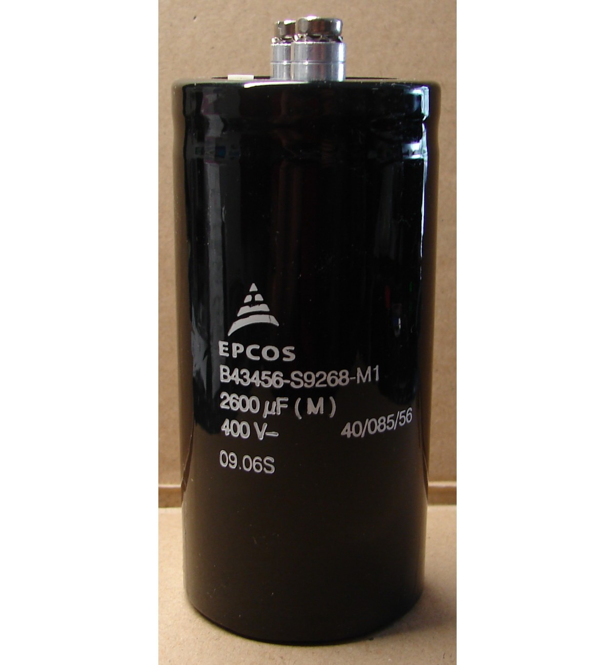 Elektrolit kondenzátor, 2600uF, 400V, 85°C, B43456-S9268-M1, átmérő 52mm, magasság 106mm, M6 csavaros rögzítés.