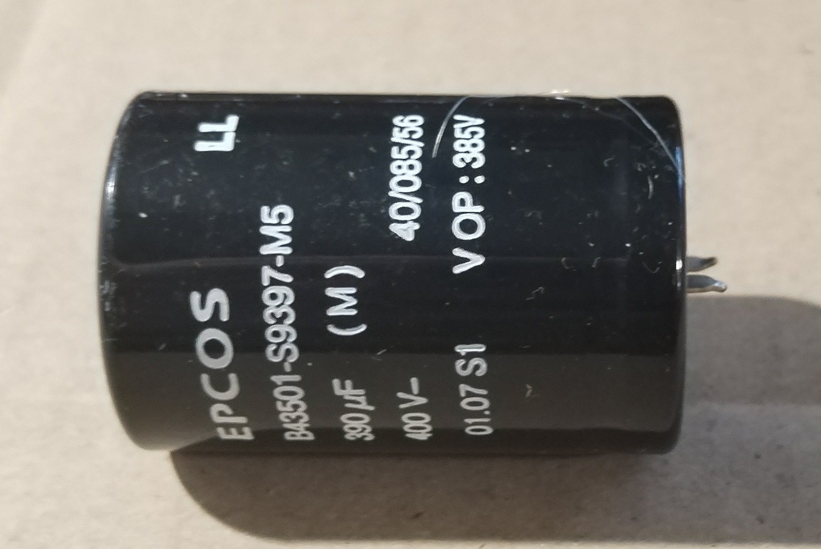 Elektrolit kondenzátor, 390uF, 400V, 85°C, B43501-S9397-M5, LONG LIFE hosszú élettartamú, átmérő 30mm, magasság 46mm, lábtávolság 10mm.