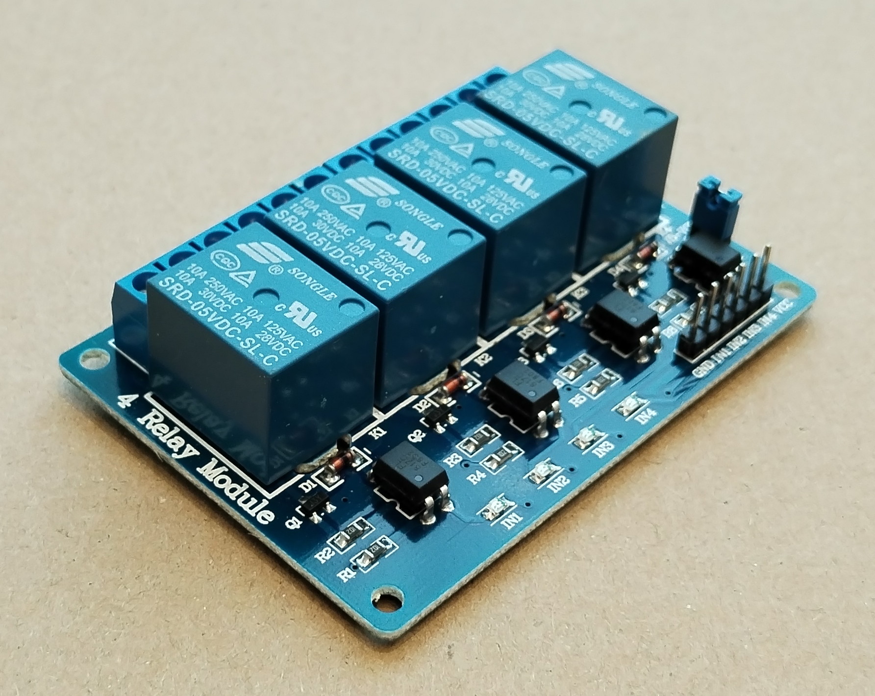Arduino/Raspberry Pi kompatibilis 4 csatornás relé modul, 5V DC, 230V AC, 10A (csatornánként), sorkapcsos csatlakozás.