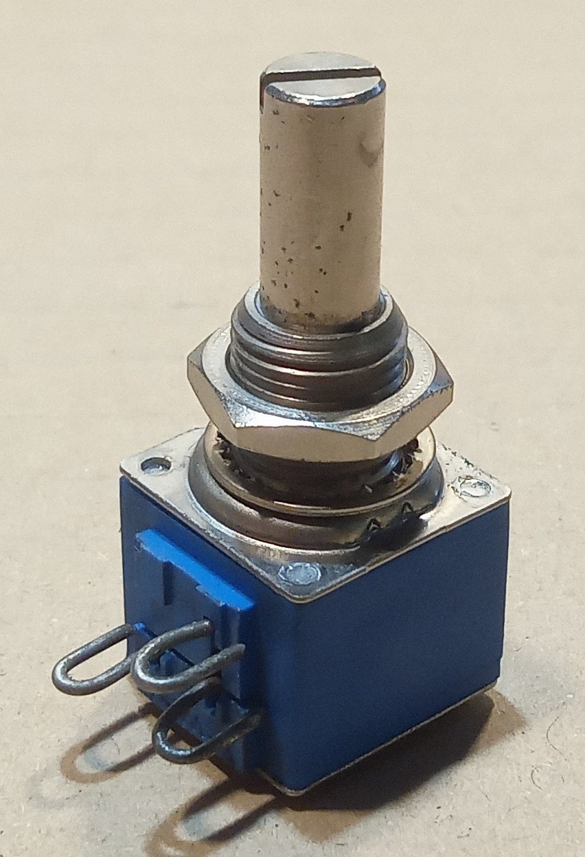 Fémházas, tengelyes, szénréteg potméter, 5k, 0,1W, mono, lineáris, tolerancia 20%, mechanikus forgási szög 240°, tengelyátmérő 6,3mm, test mérete 16x16mm, tengelyhossz 13mm, menet hosszúsága 9mm, furatátmérő 10mm, lábtávolság 5mm, max. 28V DC, 125V AC.