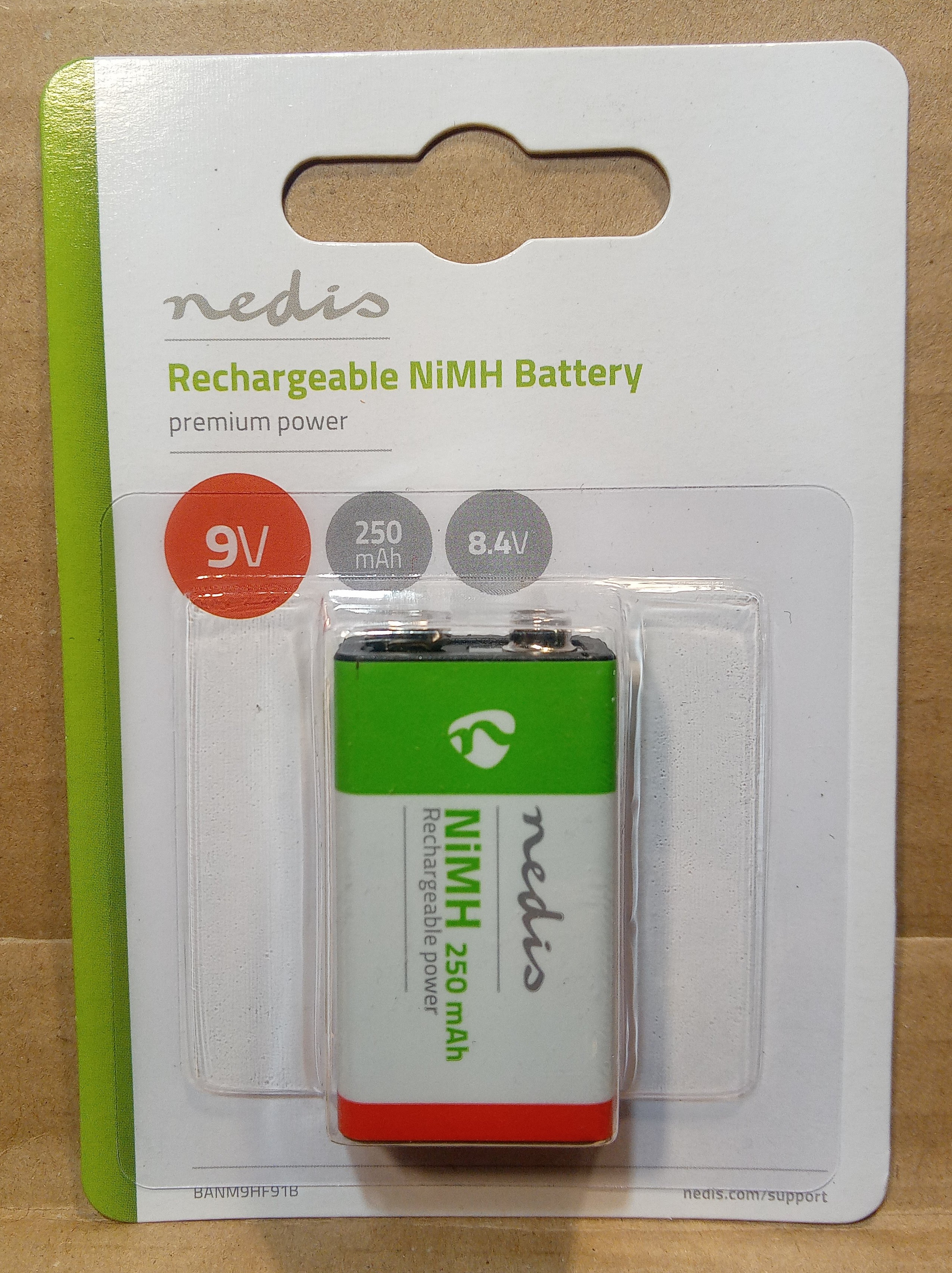 Ni-Mh akkumulátor (6LR61), 9V (8,4V), 250mAh, minimális önkisülés, 17,5x26,5x48,5mm.