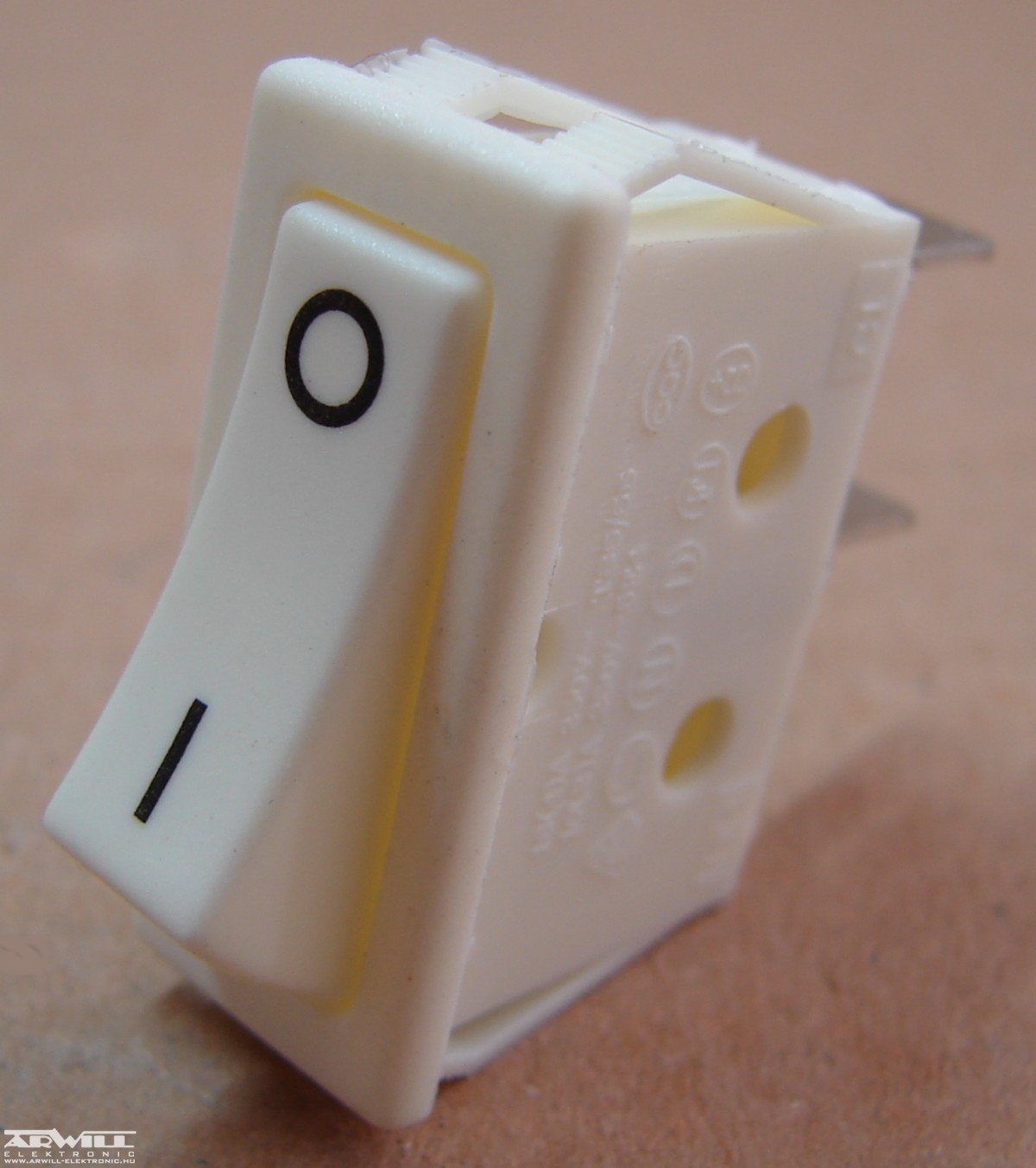 Hálózati billenő kapcsoló, 230V AC, 16A, 1 záró áramkör, 2 állás, beépítési méret 28x11mm, beépítési mélység 28mm, 6,3mm sarus csatlakozás, fehér.