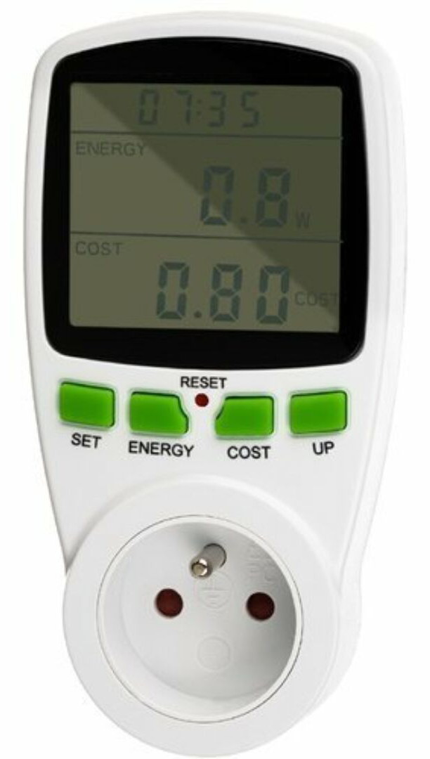 Hálózati fogyasztásmérő, működés 230V AC, 1W, mérés 230V AC, 16A, 0,3-3680W, 200-276V AC, 1,5%, 0,005-16A, 0-999kWh, 45-65Hz, 0 - 50°C, 2x1,5V LR44 (AG13) elem, pontos idő megjelenítése, hálózati feszültség megjelenítése, áram megjelenítése, hálózati teljesítmény megjelenítése, határérték beállítása, villanydíj beállítása és tárolása, hálózati frekvencia megjelenítése, üzemidő napban kijelezve, CO2 kibocsátás számítása.