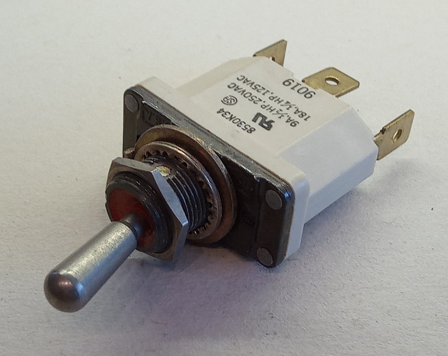 Hálózati karos kapcsoló, 250V AC, 9A, 1 morze áramkör, 2 állás, IP68 vízmentes kivitel, beépítési méret d=12mm, beépítési mélység 35mm, 6,3mm sarus csatlakozás.