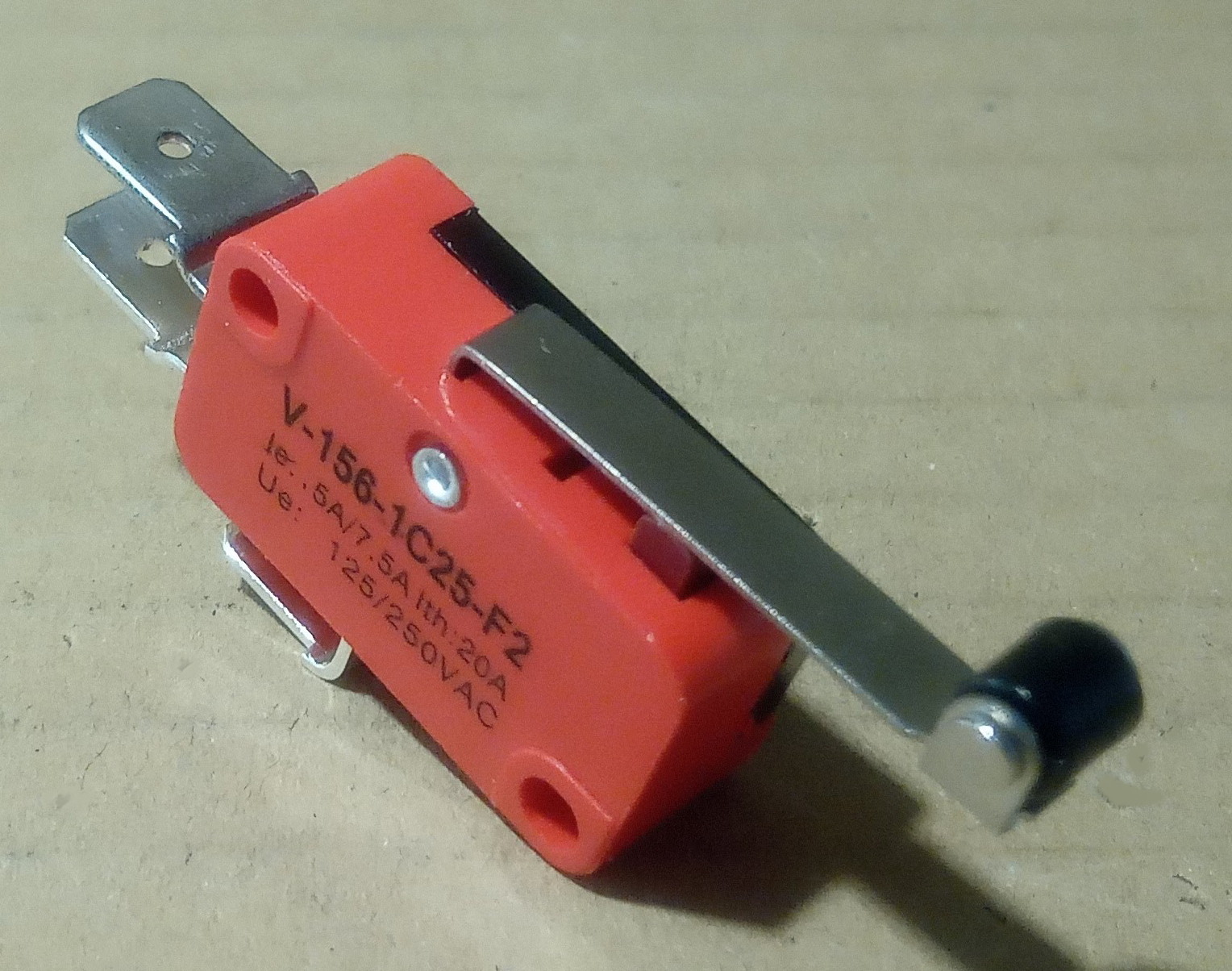 Hálózati lemezes, görgős mikrokacsoló, 250V AC, 20A, 1 morze áramkör, 2 állás, 29x16x10mm, lemezhosszúság 27mm, 6,3mm sarus csatlakozás.