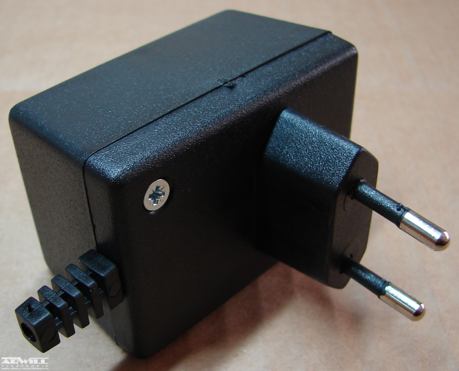 Műanyag tápegység doboz, szélesség 66mm, mélység 47mm, magasság 37mm, csavaros szerelés, kábel bevezetés, törésgátló, 2 pólusú AC dugó.