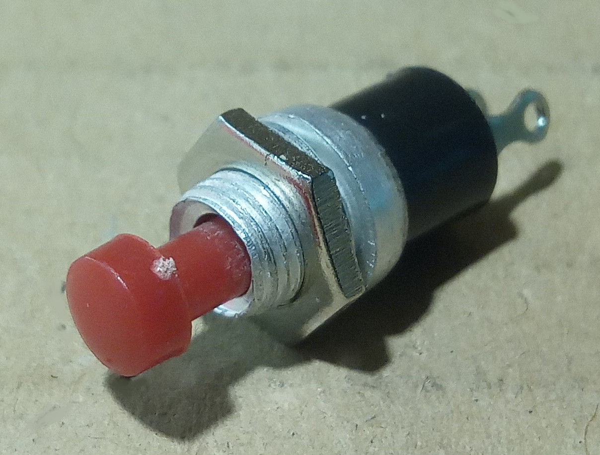 Nyomógomb, 125V AC, 1A, 1 záró áramkör, 2 állás, piros, beépítési méret d=7mm, beépítési mélység 15mm, forrszemes csatlakozás.