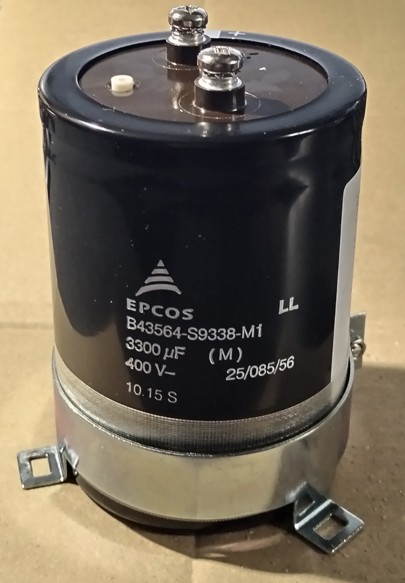 Elektrolit kondenzátor, 3300uF, 400V, 85°C, B43564-S9338-M1, LONG LIFE hosszú élettartamú, átmérő 72mm, magasság 106mm, M5 csavaros csatlakozás.