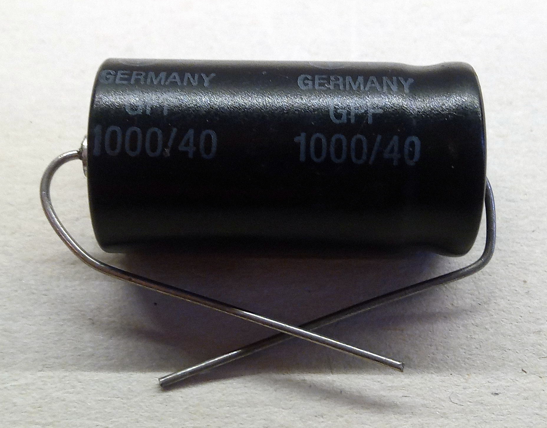 Axiális elektrolit kondenzátor, 1000uF, 40V, 105°C, B41010, átmérő 16mm, szélesség 30mm, lábtávolság 35mm.