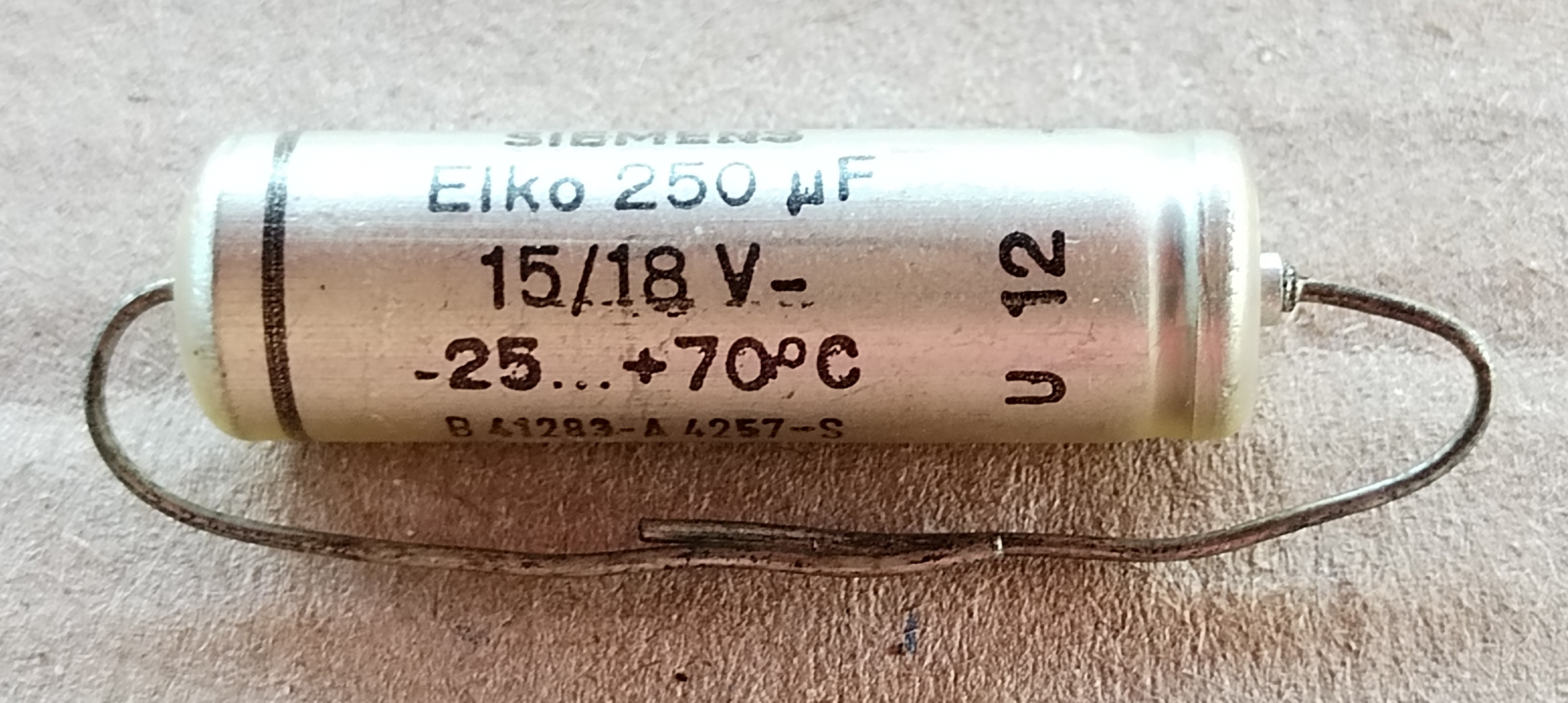 Axiális elektrolit kondenzátor, 250uF, 15/18V, 70°C, B41283, átmérő 10mm, szélesség 33mm, lábtávolság 35mm.