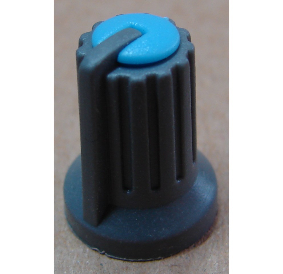 Forgatógomb, átmérő 14mm, tengelyátmérő 6mm, magasság 19mm, műanyag kivitel, recézett tengelyre.