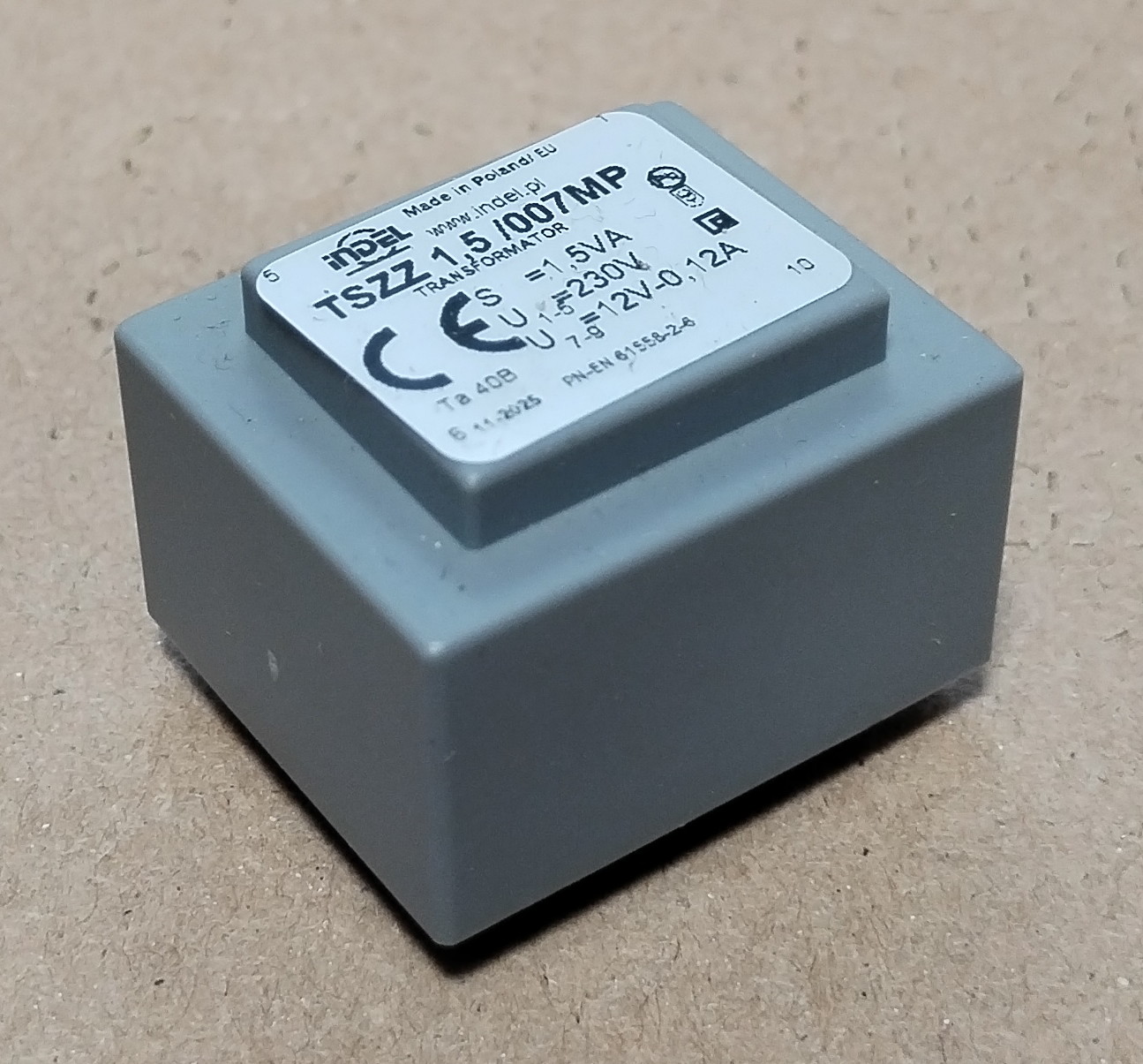 Nyákba ültethető kiöntött hálózati transzformátor TSZZ1,5, 1,5VA, 230V/1x12V, szélesség 32mm, mélység 27mm, magasság 22mm.