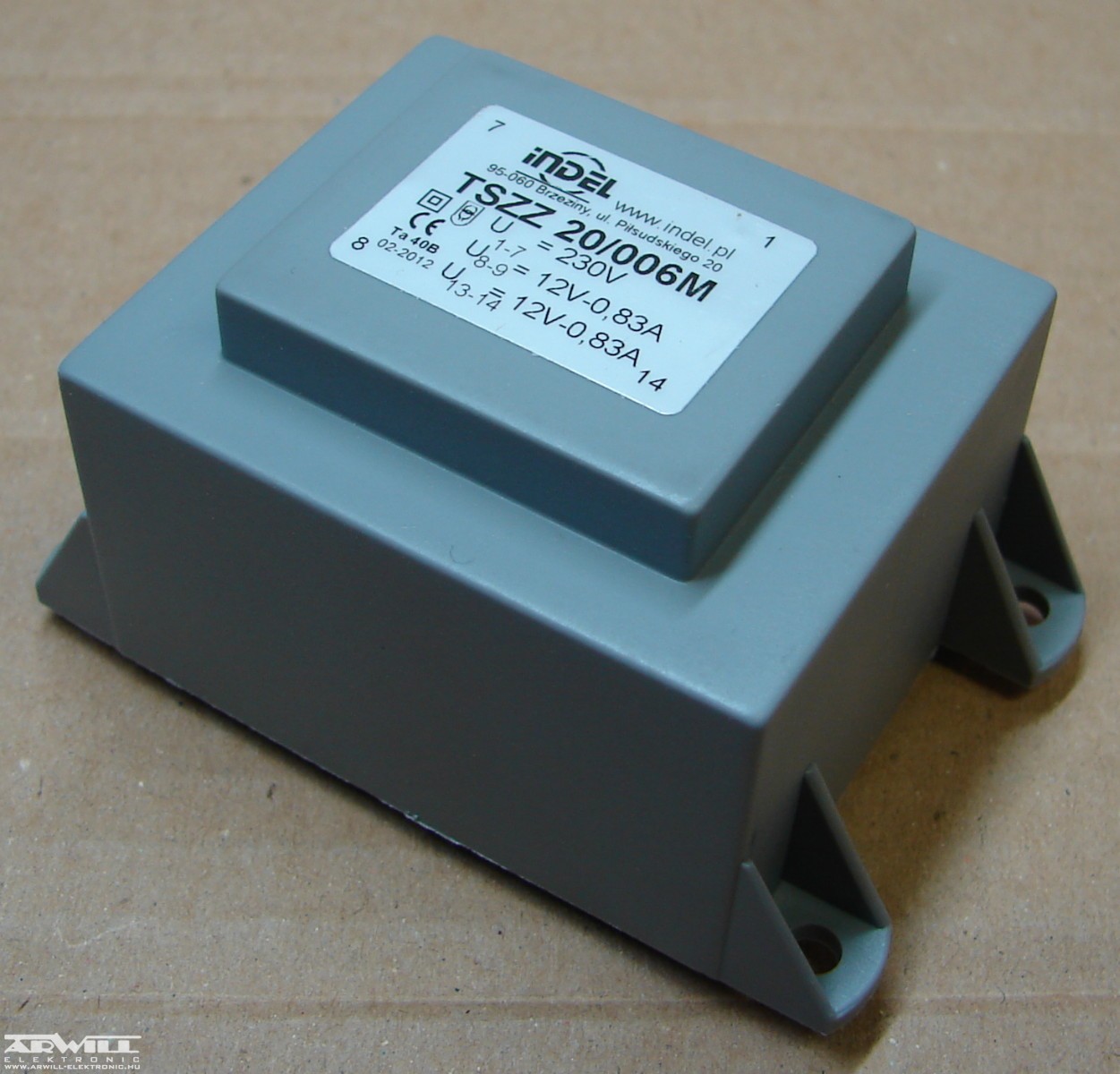 Nyákba ültethető kiöntött hálózati transzformátor TSZZ20, 20VA, 230V/2x12V, szélesség 59mm, mélység 50mm, magasság 42mm.