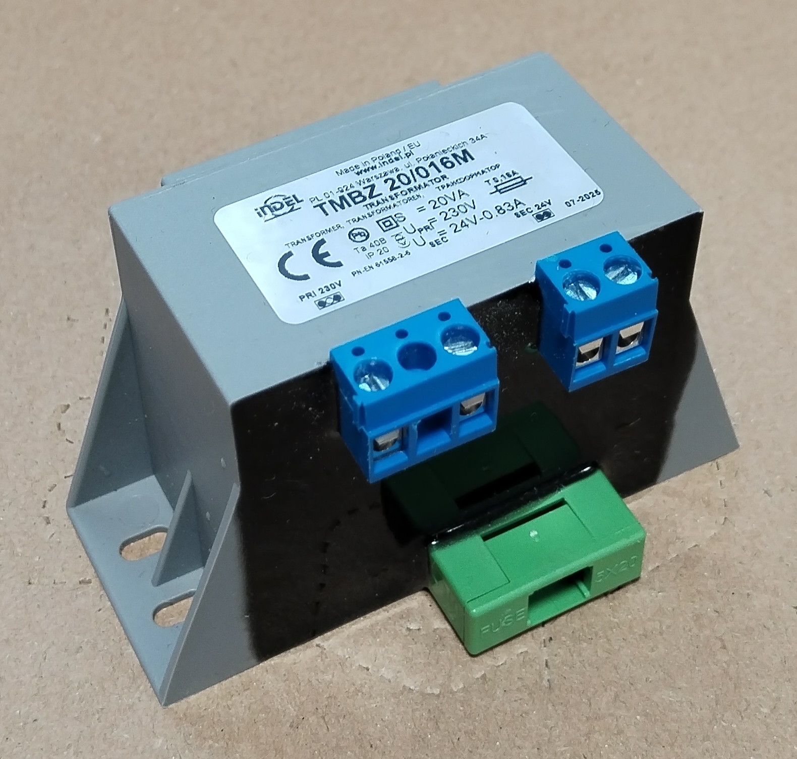 Hálózati transzformátor TMBZ20, 20VA, 230V/1x24V, 0,83A, primer biztosíték, sorkapcsos kivezetés, kiöntött kivitel.