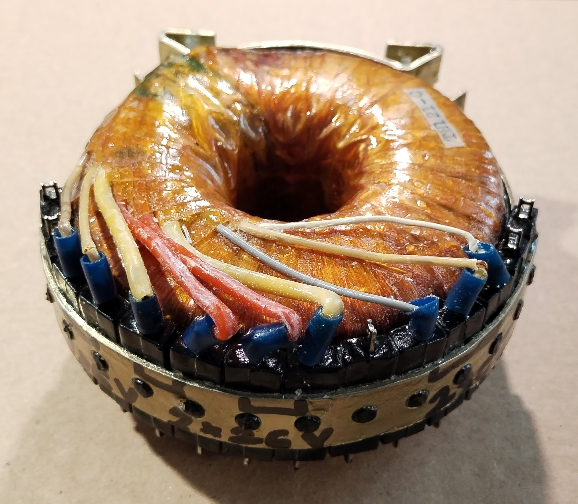 Hálózati toroid transzformátor 160VA, 230V/2x26V, 1x6V, külső átmérő 100mm, belső átmérő 25mm, magasság 45mm.