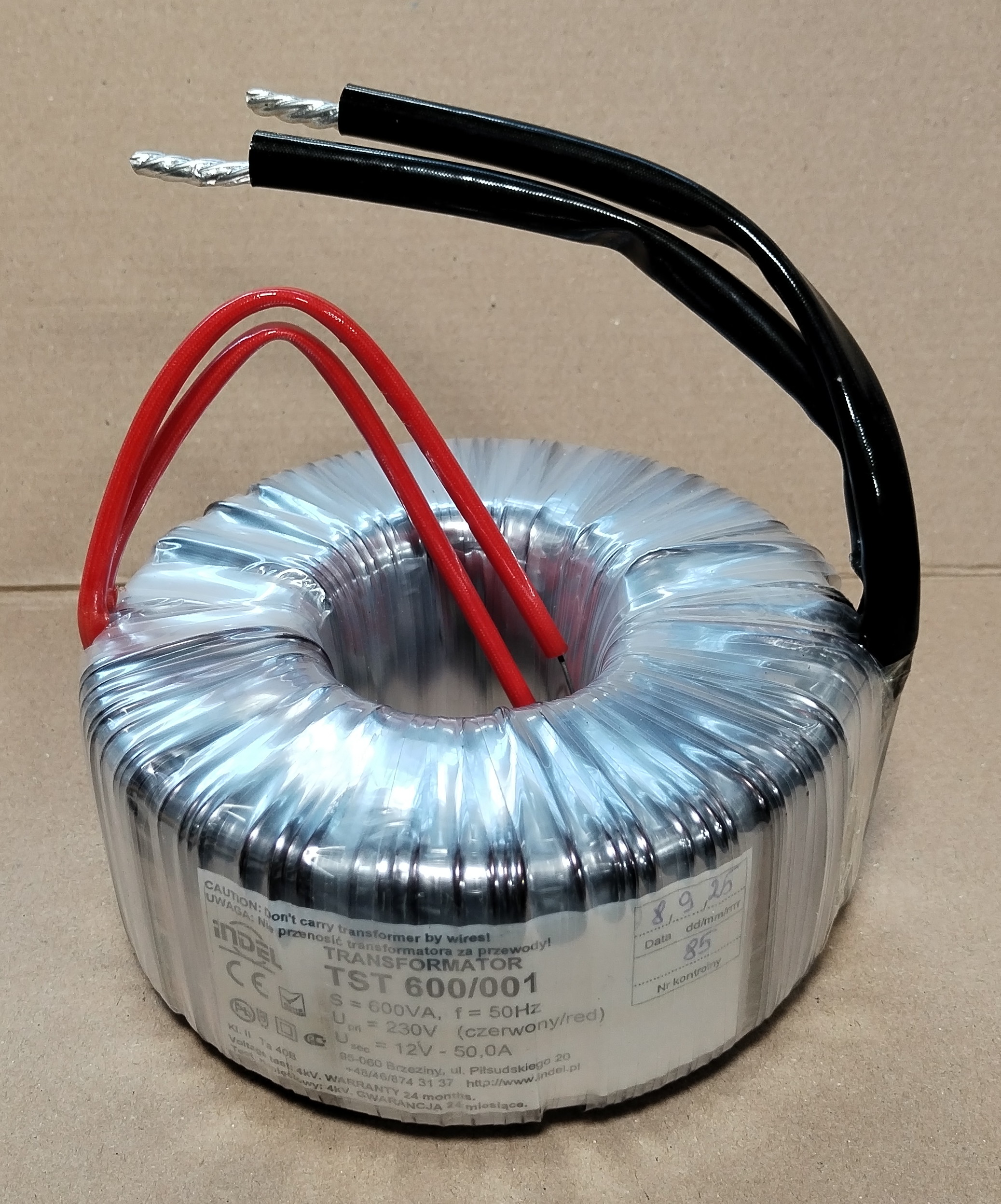 Hálózati toroid transzformátor TST600, 600VA, 230V/1x12V, külső átmérő 155mm, belső átmérő 60mm, magasság 65mm.