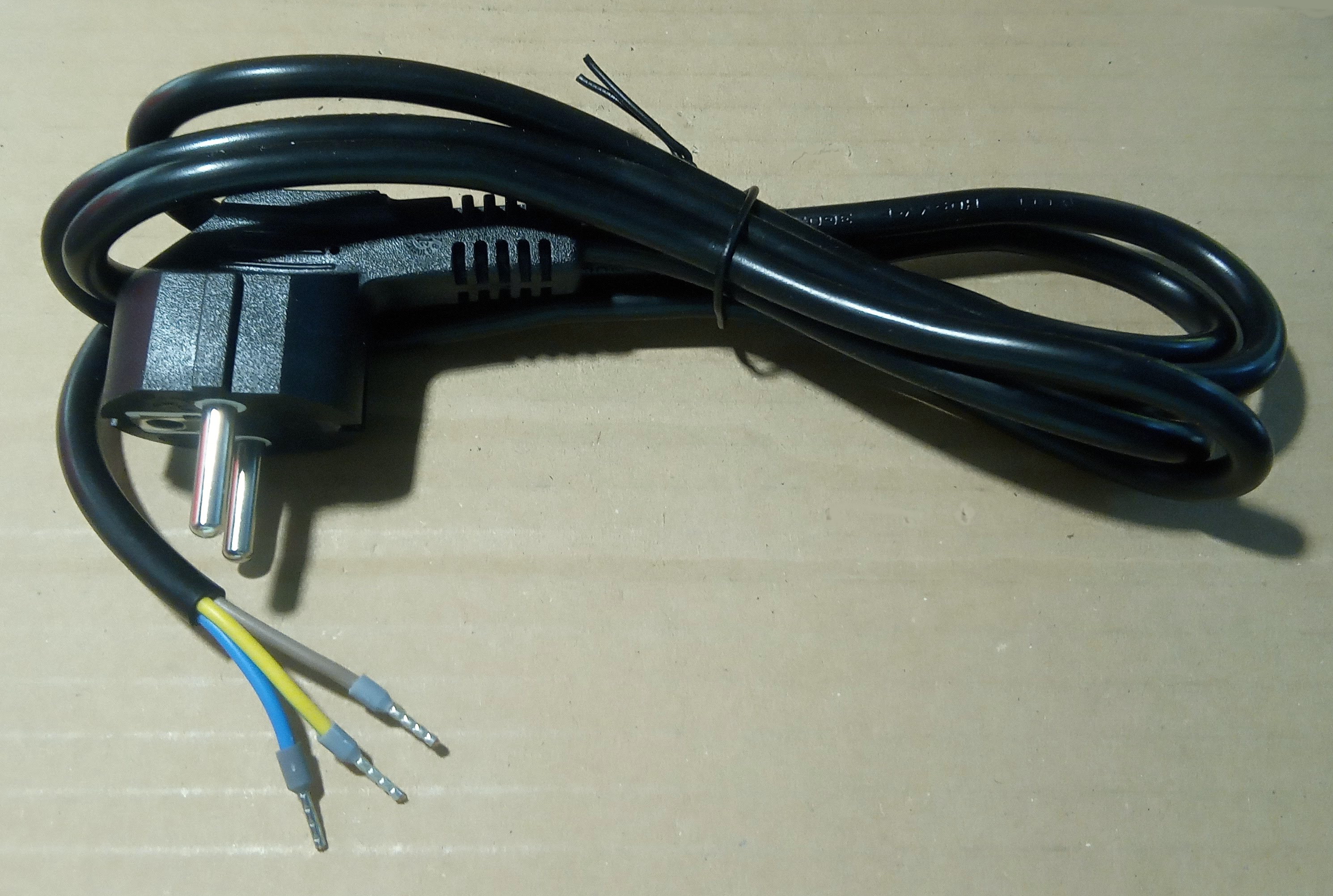 Hálózati kábel blankolt véggel, 3x1,5mm2, földelt hálózati csatlakozóval, 1,3m.